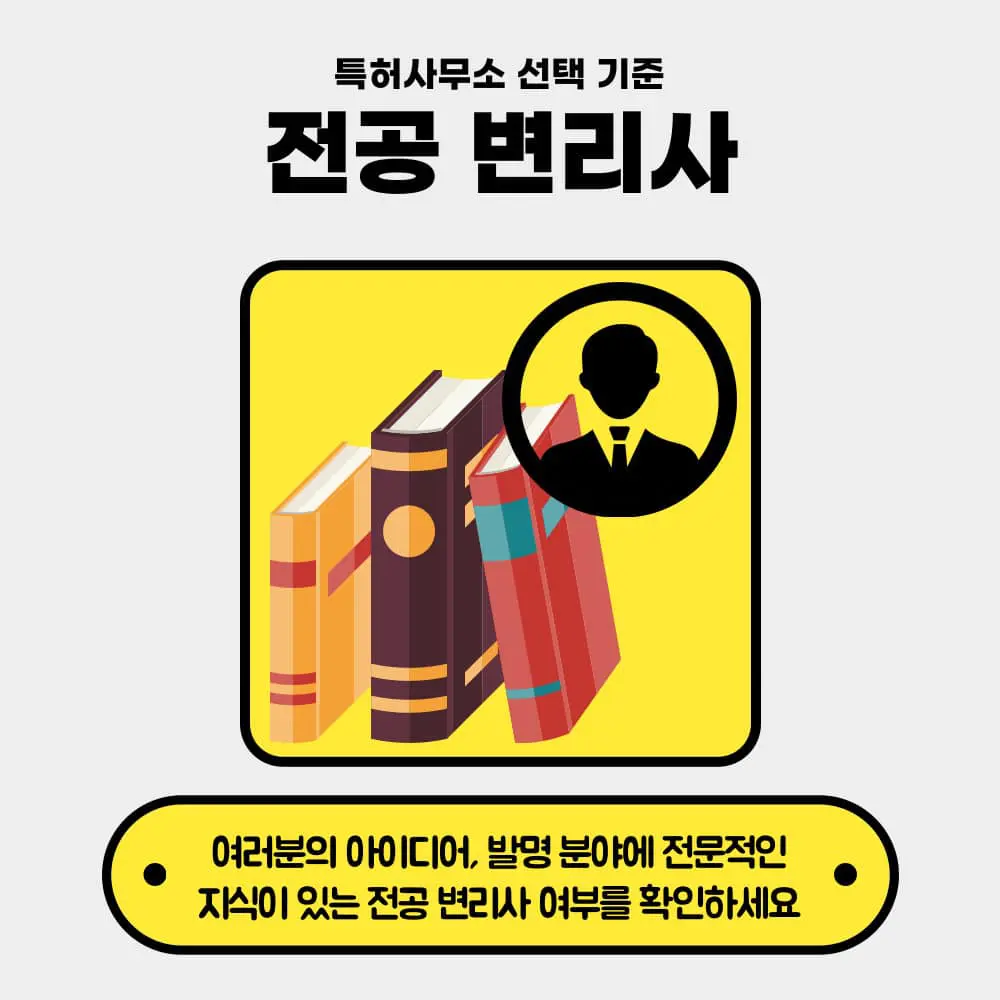 첫째로 여러분이 맡기시려는 사건 분야를 전공한 변리사를 찾으셔야 합니다. 다양한 전공을 가진 변리사 중에는 기계, 전자, 반도체, 통신, 바이오, 재료, 화학 등 여러분께서 처리를 희망하시는 사건의 분야를 전공한 변리사가 존재합니다. 전공이 맞는다면 출원을 위한 발명 개량이라던지, 더 넓은 권리를 확보하기 위한 업그레이드 등 정확하고 깊은 난이도의 업무를 처리할 수 있게 됩니다.