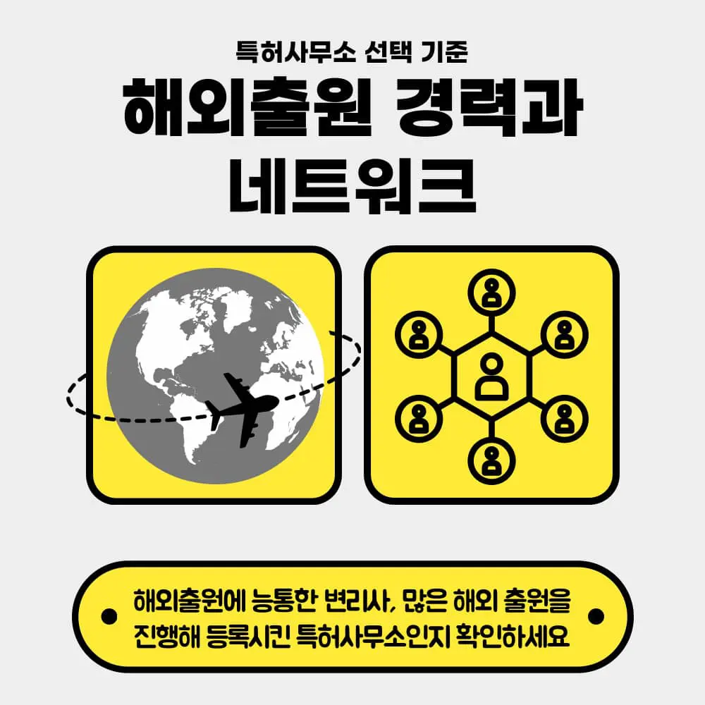또한 해외출원은 해외 현지 대리인을 통해 사건을 진행해야 하는 경우가 대부분입니다. 따라서 여러분께서 위임하시려는 사건이 해외사건이라면, 해외사건에 강점이 있는 특허사무소인지, 또한 담당변리사가 해외사건에 대한 경험이 충분한 변리사인지 그리고 해외 현지와의 네트워크 구축을 해 놓았는지 꼭 알아보셔야 합니다.