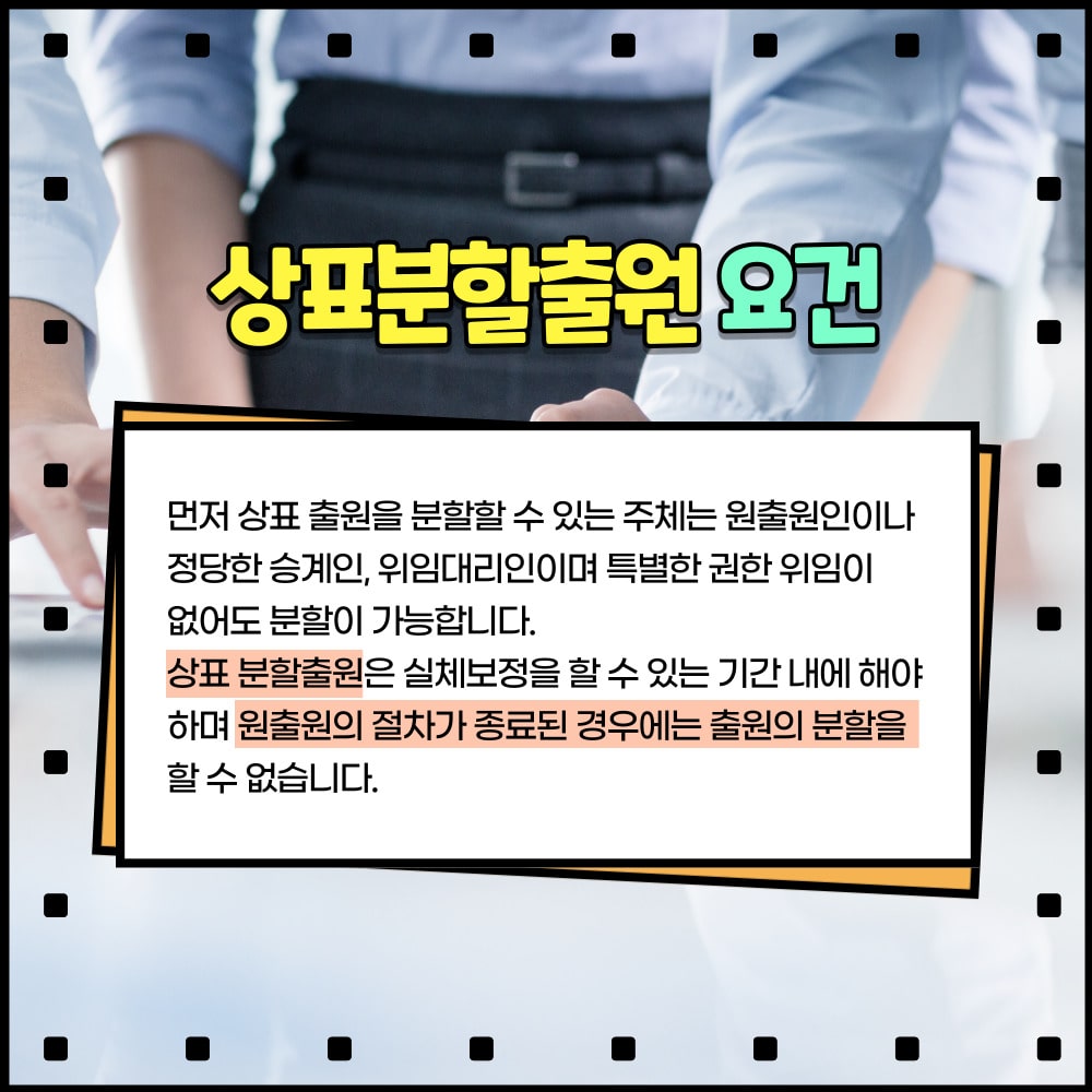 먼저 상표출원을 분할할 수 있는 주체는 원출원인이나 정당한 승계인, 위임대리인이며 특별한 권한 위임이 없어도 분할이 가능합니다.