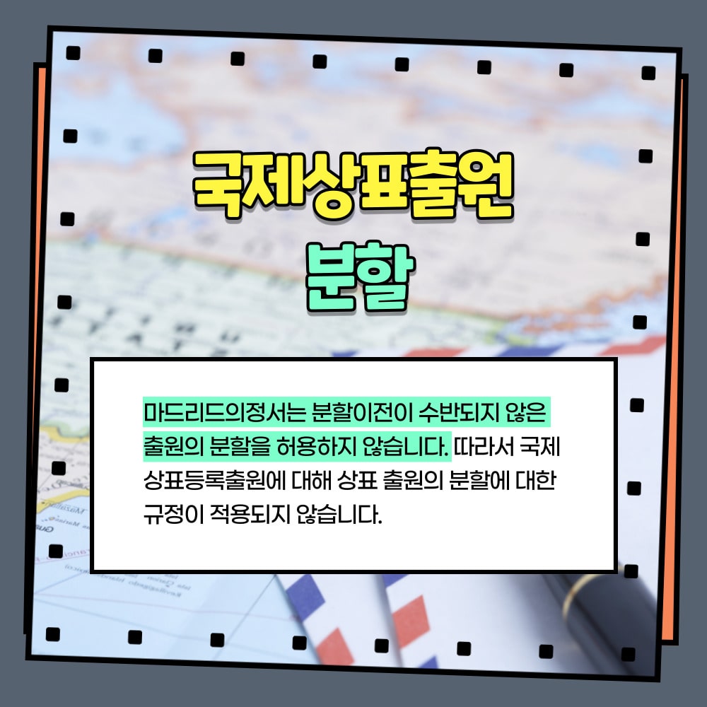 따라서 국제상표등록출원에 대해 상표출원의 분할에 대한 규정이 적용되지 않습니다.