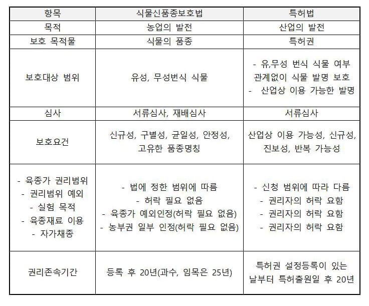 식물신품종보호법의 보호는 설정등록된 날로부터 최대 20년(수목은 25년)까지이며, 특허는 설정된 날로부터 출원일로 최대 20년까지의 독점을 보장해줍니다.