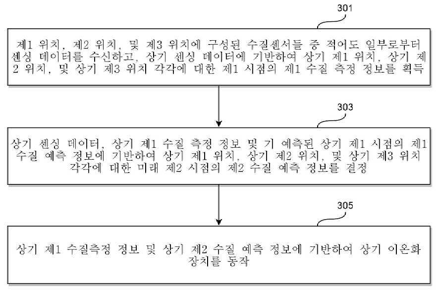 요약 : 본 발명의 다양한 실시 예에 따르면, 유입구 및 유출구를 포함하여 구성되는 유체배관에서, 순차적으로 설정된 제1 위치, 제2 위치, 및 제3 위치 각각의 상기 유체배관 내부에 수질센서가 구성되고, 상기 제1 위치 및 제2 위치 사이에 설정된 제4 위치의 상기 유체배관 내부에 이온화 장치가 구성된 상태에서, (a) 상기 제1 위치, 제2 위치, 및 제3 위치에 구성된 수질센서들 중 적어도 일부로부터 센싱 데이터를 수신하고, 상기 센싱 데이터에 기반하여 상기 제1 위치, 상기 제2 위치, 및 상기 제3 위치 각각에 대한 제1 시점의 제1 수질 측정 정보를 획득하는 단계; (b) 상기 센싱 데이터, 상기 제1 수질 측정 정보 및 기 예측된 상기 제1 시점의 제1 수질 예측 정보에 기반하여 상기 제1 위치, 상기 제2 위치, 및 상기 제3 위치 각각에 대한 미래 제2 시점의 제2 수질 예측 정보를 결정하는 단계; 및 (c) 상기 제1 수질 측정 정보 및 상기 제2 수질 예측 정보에 기반하여 상기 이온화 장치를 동작하는 단계;를 포함하는, 이온화 장치를 이용하여 유체배관을 관리하는 관리장치의 동작 방법 및 그 장치를 제공할 수 있다.