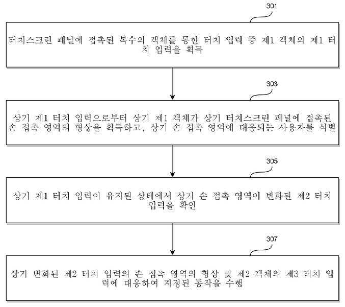 요약 : 본 발명의 다양한 실시 예에 따르면, 전자칠판은 인셀(in-cell) 방식의 터치스크린 패널을 포함하는 상태에서, (a) 상기 터치스크린 패널에 접촉된 복수의 객체를 통한 터치 입력 중 제1 객체의 제1 터치 입력을 획득하는 단계; (b) 상기 제1 터치 입력으로부터 상기 제1 객체가 상기 터치스크린 패널에 접촉된 손 접촉 영역의 형상을 획득하고, 상기 손 접촉 영역에 대응되는 사용자를 식별하는 단계; (c) 상기 제1 터치 입력이 유지된 상태에서 상기 손 접촉 영역이 변화된 제2 터치 입력을 확인하는 단계; 및 (d) 상기 변화된 제2 터치 입력의 손 접촉 영역의 형상 및 제2 객체의 제3 터치 입력에 대응하여 지정된 동작을 수행하는 단계;를 포함하는, 전자칠판의 터치 입력 처리 방법 및 그 전자칠판을 개시한다.