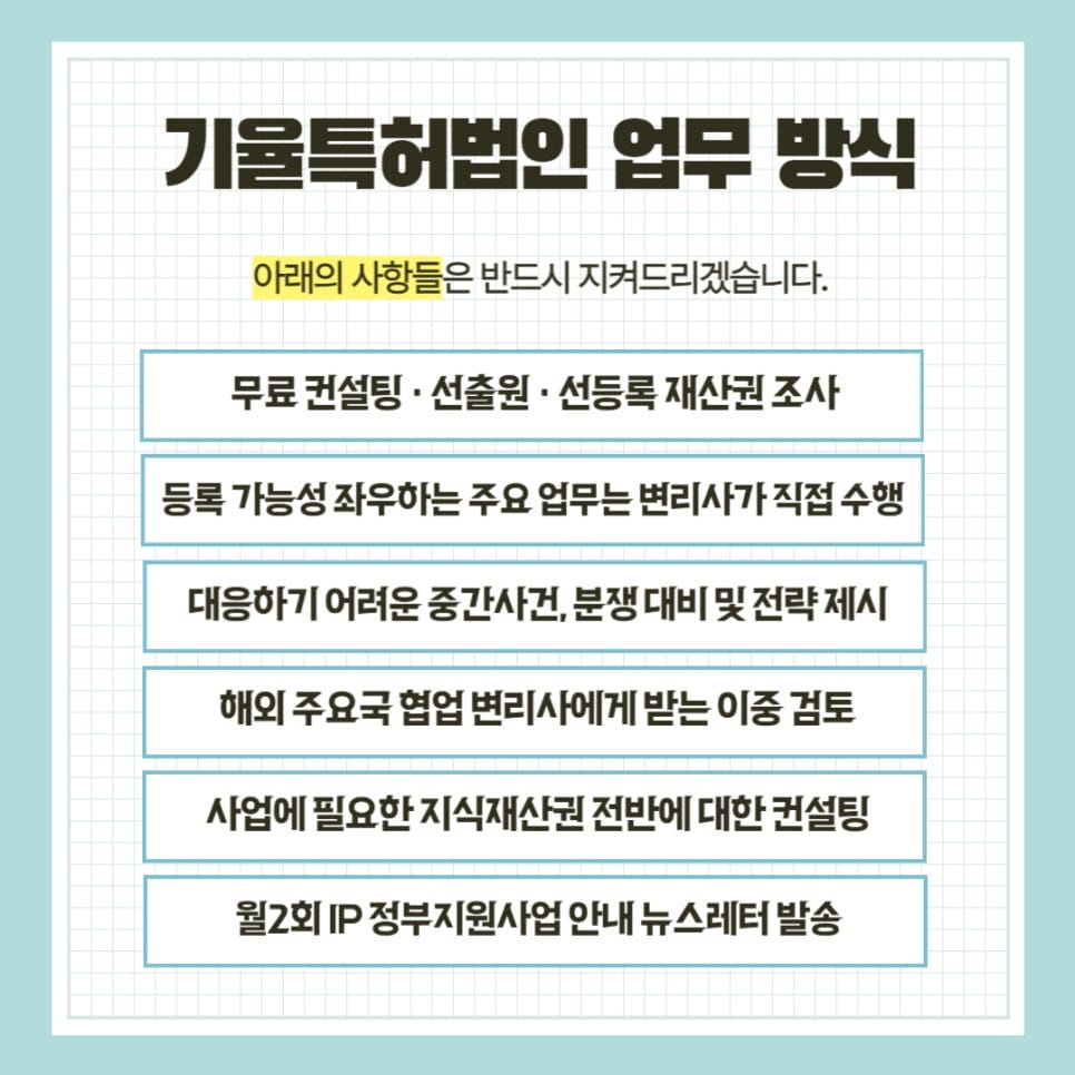 특허청에서 인정한 산업재산권 진단 전문기관인 기율은 전공별 변리사들이 직접 컨설팅부터 등록 가능성 검토,