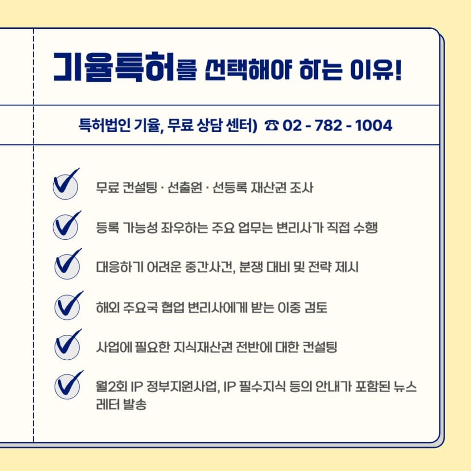 특허청에서 인정한 산업재산권 진단 전문기관인 기율은 전공별 변리사들이 직접 컨설팅부터 등록 가능성 검토,