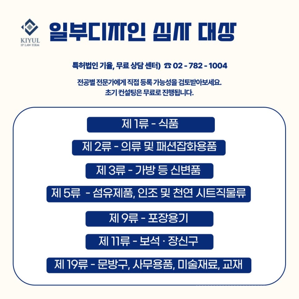 일부심사를 받을 수 있는 분야는 액세서리, 의류, 양말, 가방 등에 해당하는 유행에 민감한 디자인의 외관이니